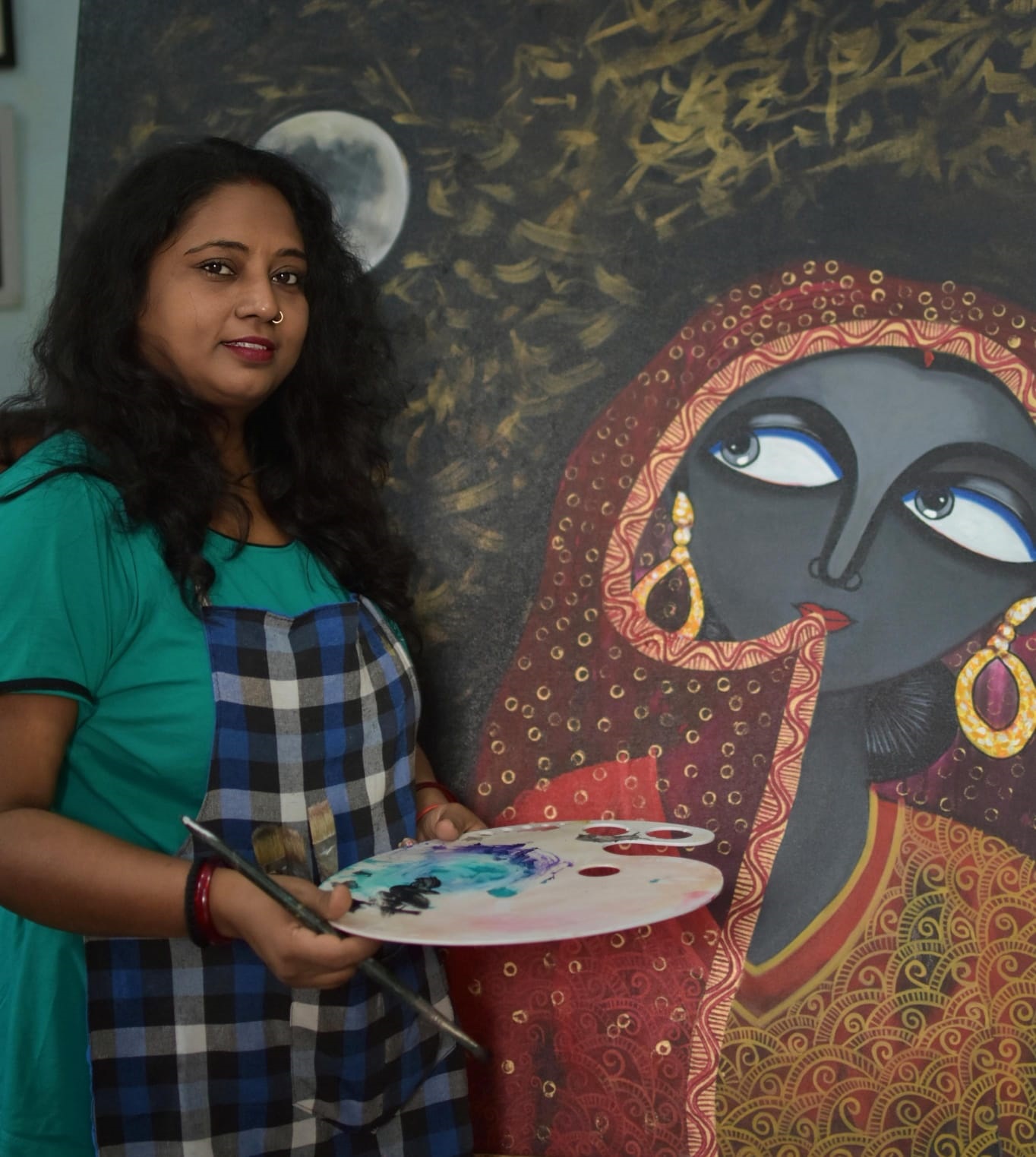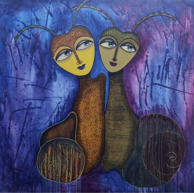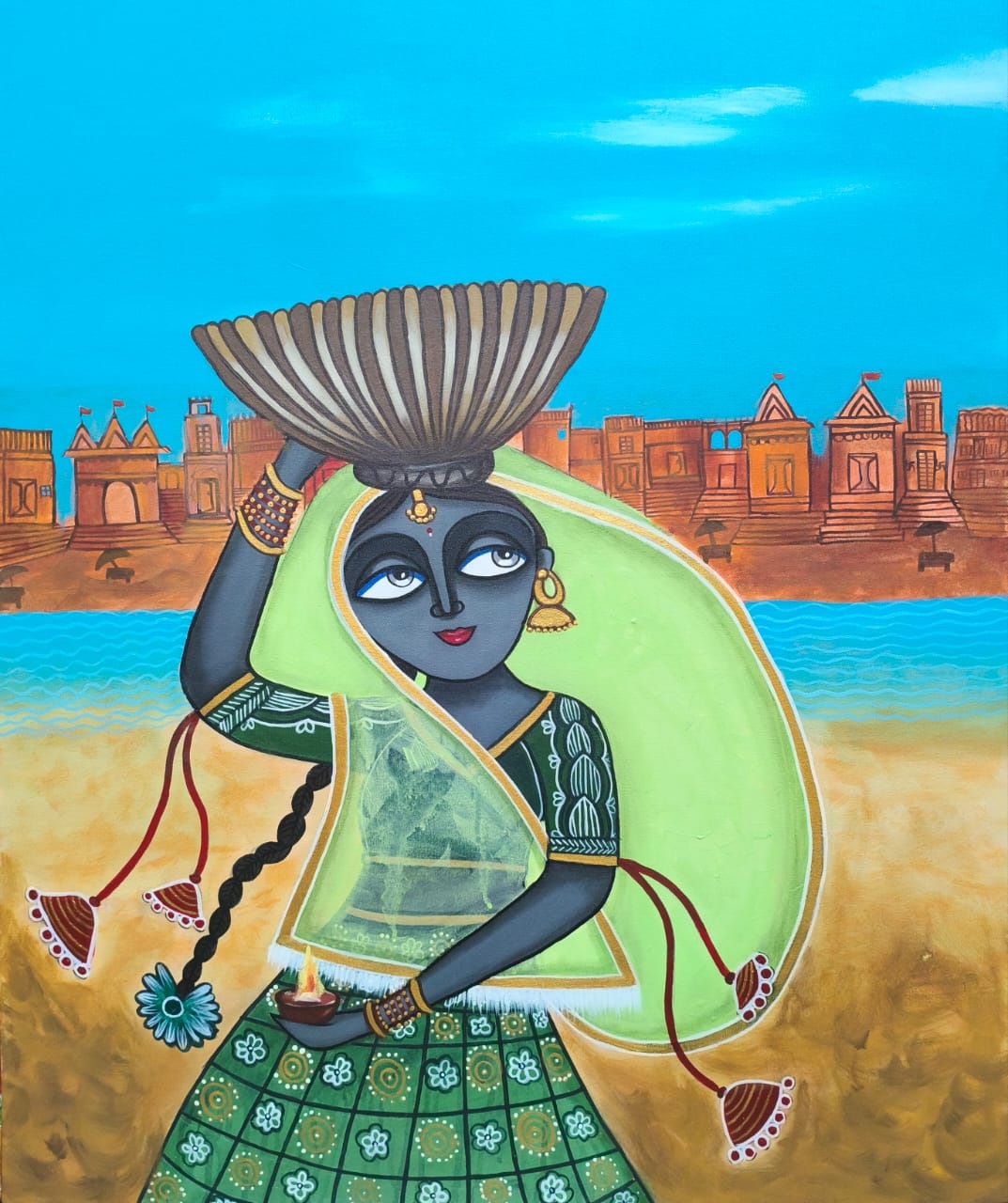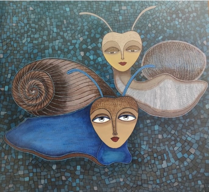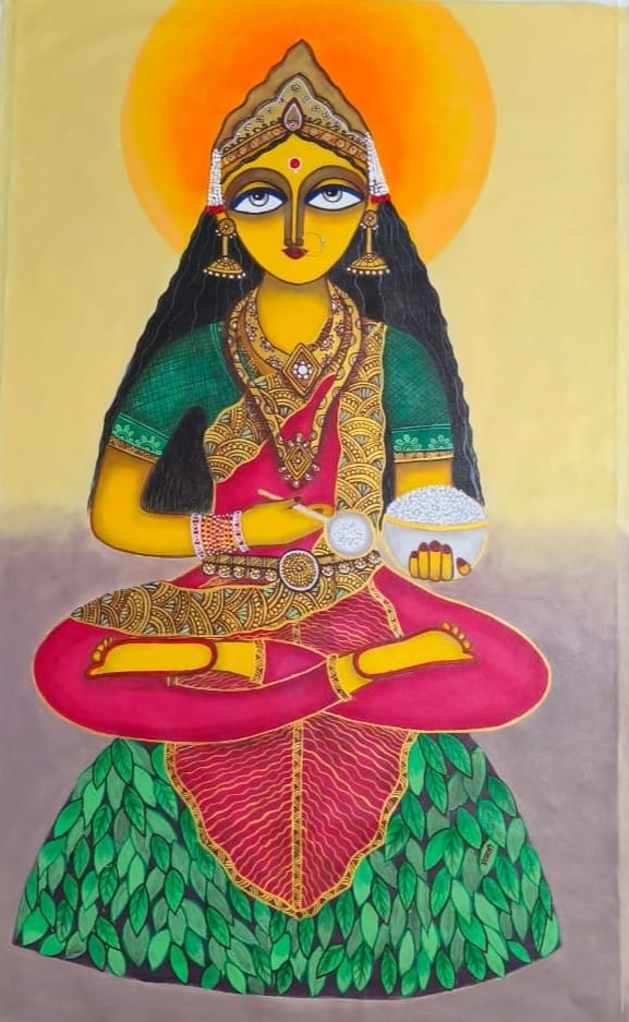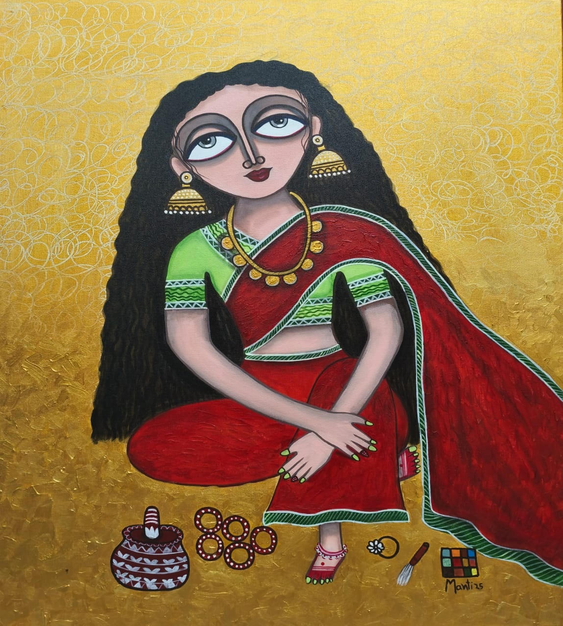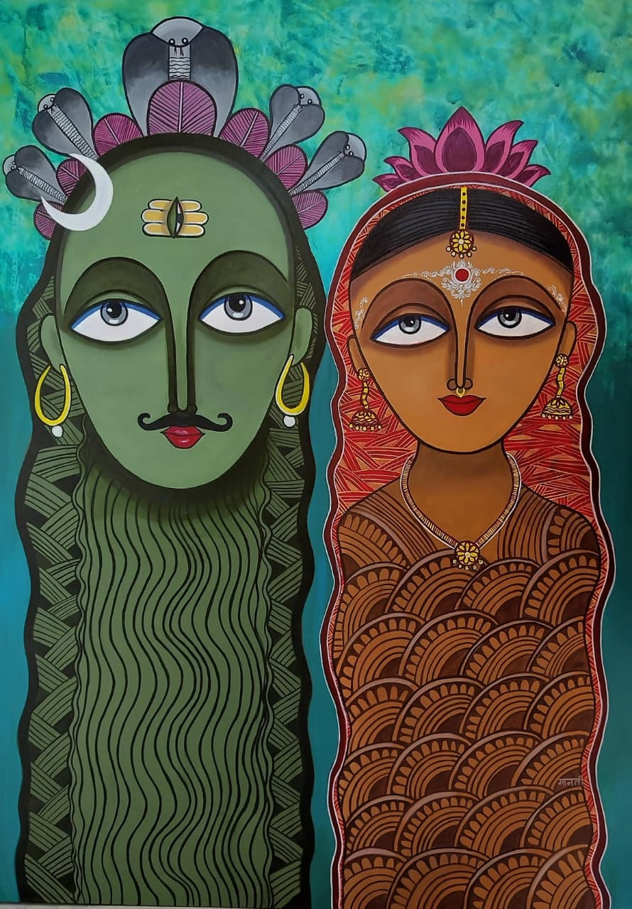 Manti Sharma, a self taught artist. she spent most of her childhood in bhelatand, Dhanbad district, now in Jharkhand. In the recent past, she has devoted more time to developingas a fine artist and would like to continue on the path. Now she is a freelance artist and a homemaker. She is in love with both the tradition and its themes. Her painting symbolizes the ‘Empowerment of Women’ and the quest for education stylized with intensity of colour, contrast and rhythmic bold lines. A winner of TAZZA AWARD, given by master chef of india Pankaj bhadauriya. Mantihas served the cause of art and painting for all her life in Varanasi, she was inspired by by the cultural activities being carried out by people. Then she started working in her own style, at first she was shy but after sometime she was in flow and worked with many artists of india and exhibitions, soon gained popularity. Her inspiration were AMRITA SHERGIL, LAXMA GOND AND A.RAMCHARAN. Naive in approach, decorative, design oriented………..but charismatic. Hope you all looking her painting enjoyed as much as she enjoys creating them. The shapes, colour, texture that abound in folk, inspire the colourful abstract and impressionisticimage she paints some reflection of traditional art forms can be observed in her works. She received many awards and participated in number of groups exhibition in india. Her collections are in Indian subcontinent and abroad. She hopes that her work will bring altogether a piece of happiness and prosperity to entire world.